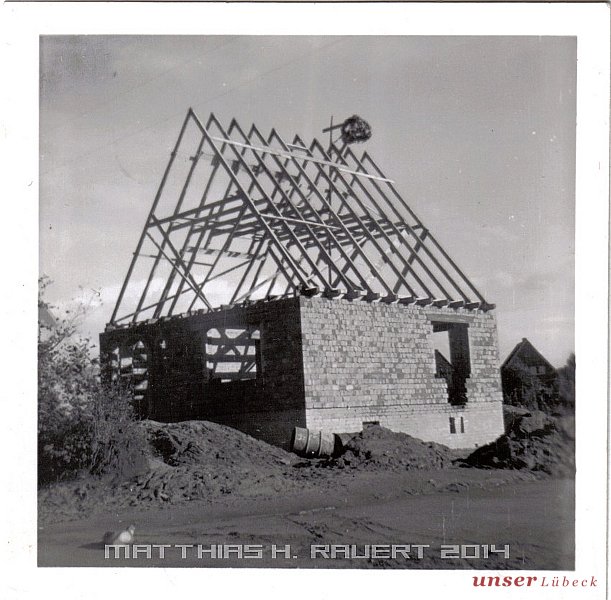 Am Schellbruch 40, nach Nordosten, Architekt: Friedrich-Wilhelm Seinsche. Im Vordergrund ein Bauarbeiter. Der Rohbau stand im Sommer 1950 monatelang still und mehr als einmal unter Wasser, weil die Bauarbeiter landesweit für höhere Löhne streikten.
