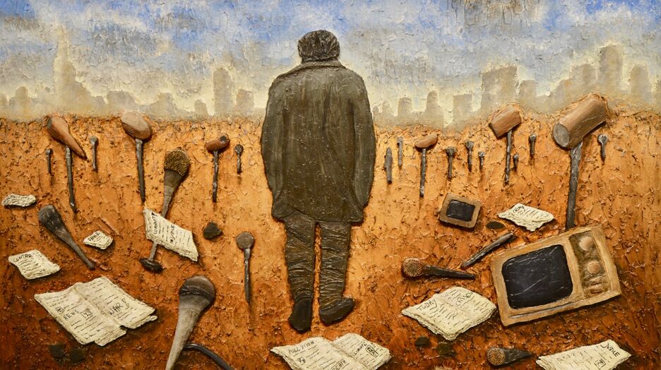 Wie ein aktueller Kommentar wirkt sein Bild „Pfad der Würde“, ein scheinbares Kriegsbild, das an die Ukraine oder Gaza erinnert. Ein zerstörter Weg führt durch Ruinen aus der Dunkelheit in ein entferntes, lichtes Grau. Blitzt da etwa Hoffnung auf? Andere Bilder zeigen da weniger positives, wie zum Beispiel „Die Stimme über dem Rauschen“, das eine Welt zeigt, die im Übermaß der Informationen zerfällt. Die Überfrachtung des Einzelnen in einer Zeit der Überflutung aus Sozialen Medien und Fake News.