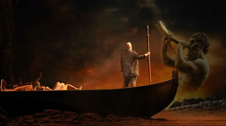 Auf das Jenseits vorbereiten wolle er, zumal seine Hauptfigur im Angangsstück der Fährmann Charon sei, den Puccini aber Michele nenne. Der Besucher unten, das wird klar, soll sich darauf einstellen, dass alles Geschehen der Divina Commedia zugeordnet werde. Man mag sich fragen, was nun, wenn jemand die katholisch geprägten Fantasien Dantes nicht im Kopfe verfügbar hat? Warum auch, wenn der Abend nach diesem Prolog ganz konventionell mit der Untat beginnt, die der Schleppkahnfahrer Michele (Stefano Meo) als Rivalenmord begeht. Nun soll er der mythische Totenschiffer sein?
