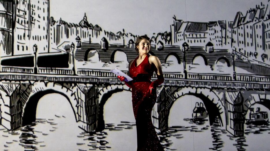 Vor dem Chor agieren zwei mit Stift, Kreide oder Pinsel malende oder Bildchen verschiebende „Live-Illustratoren“ auf einem Projektor, der seine Bilder auf eine Fläche hoch oben am Bühnenportal wirft. Zusammen mit den von einem Erzähler in Vertretung von Loriot gesprochenen Texten müssen die Zuschauer daraus die Handlung erfassen, was unter Einfluss so mancher Mätzchen glänzend gelingt, beim Erzähler (Steffen Kubach), noch mehr bei den punktgenau zu Song oder Text Agierenden (Robert Nippoldt, Lotta Stein).